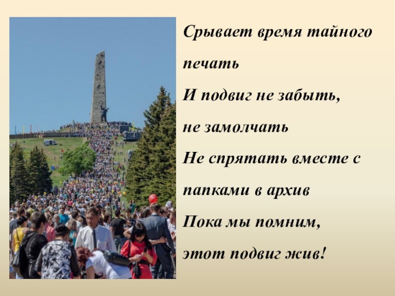Срывает время тайного печатьИ подвиг не забыть, не замолчатьНе спрятать вместе с папками в архивПока мы помним,