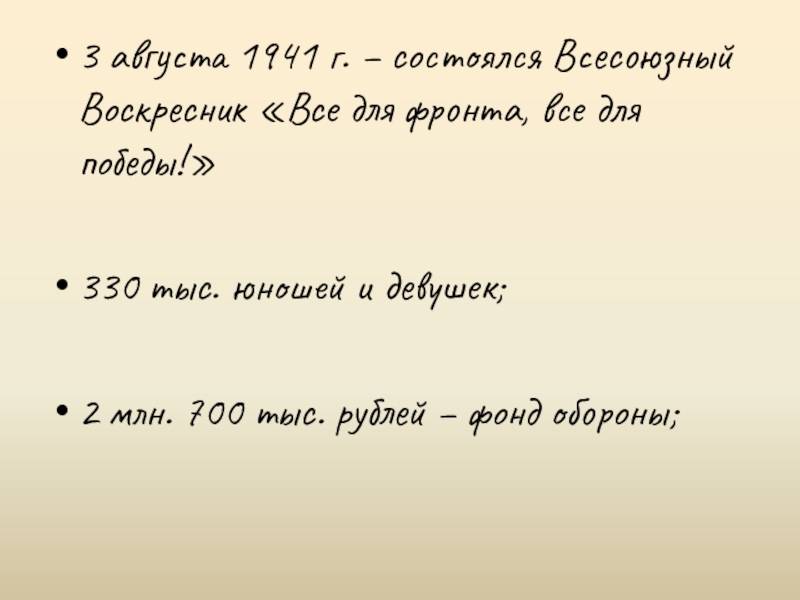 3 августа 1941 г. – состоялся Всесоюзный Воскресник «Все для фронта, все для победы!»330 тыс. юношей и