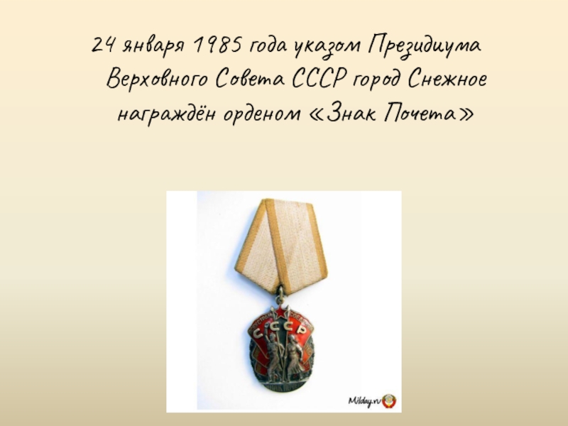 Слайд 5624 января 1985 года указом Президиума Верховного Совета СССР город Снежное