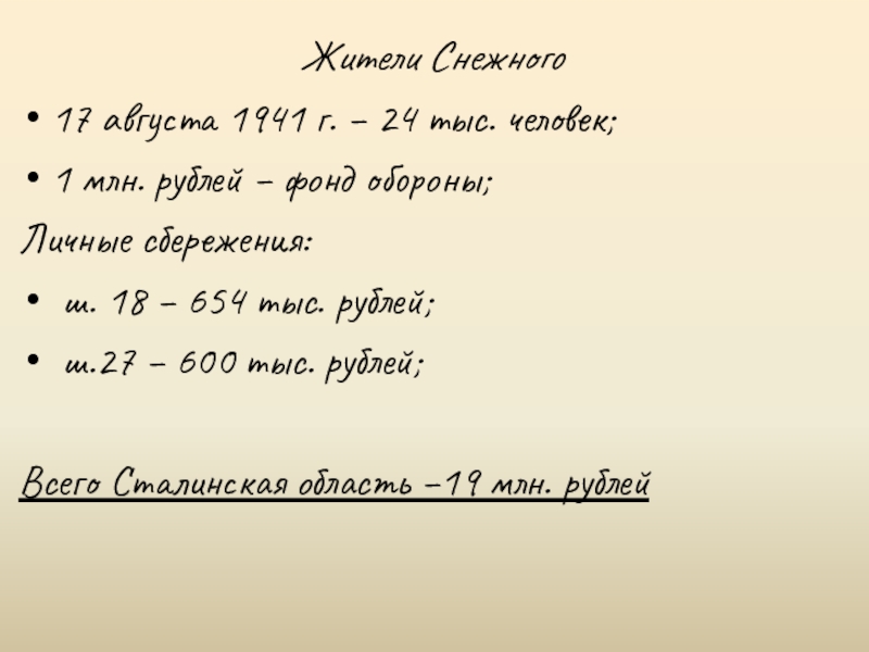 Жители Снежного17 августа 1941 г. – 24 тыс. человек;1 млн. рублей – фонд обороны;Личные сбережения: ш. 18