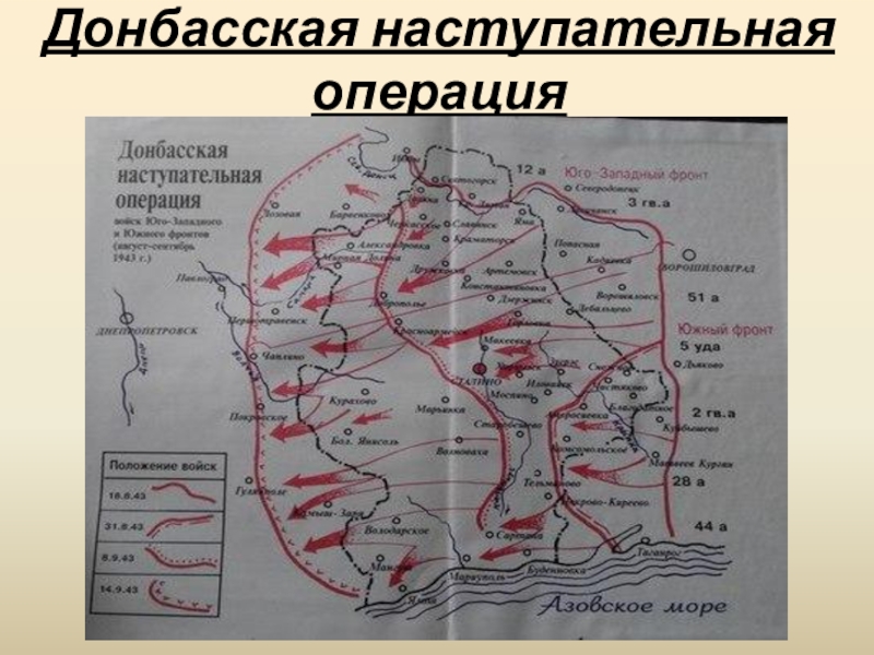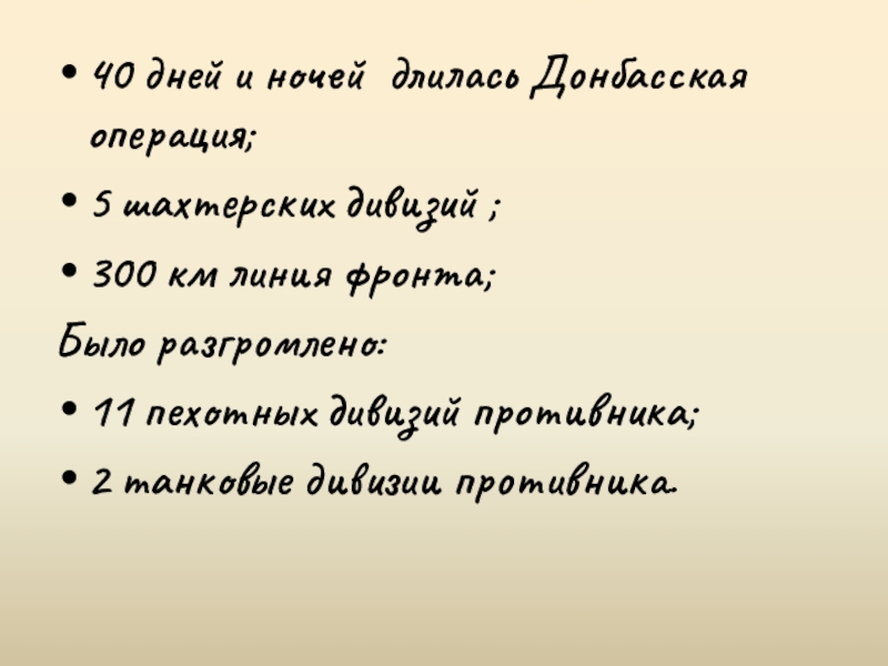 40 дней и ночей длилась Донбасская операция;5 шахтерских дивизий ; 300 км линия фронта; Было разгромлено:11 пехотных