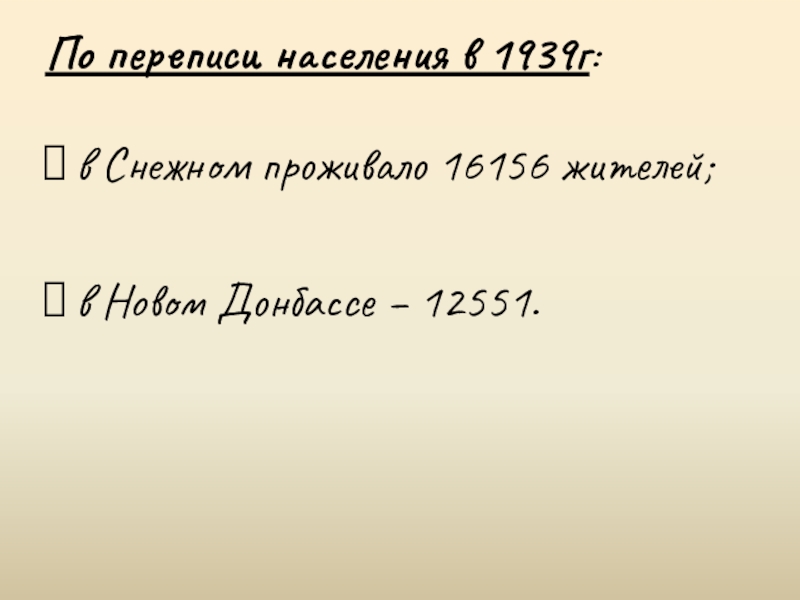 По переписи населения в 1939г:  в Снежном проживало 16156 жителей;в Новом Донбассе – 12551.