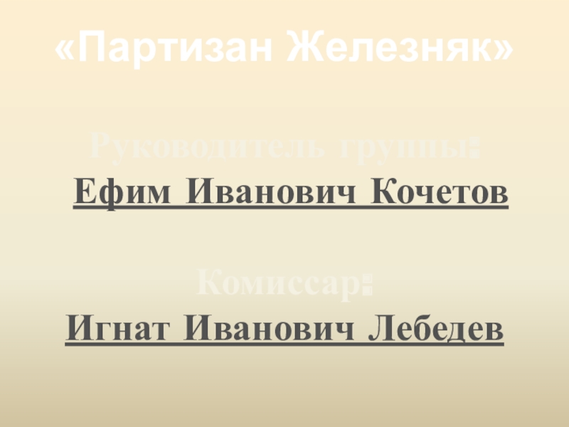 «Партизан Железняк»Руководитель группы:  Ефим Иванович КочетовКомиссар:  Игнат Иванович Лебедев