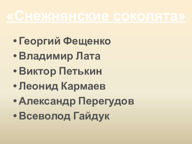 «Снежнянские соколята»Георгий ФещенкоВладимир ЛатаВиктор ПетькинЛеонид КармаевАлександр ПерегудовВсеволод Гайдук