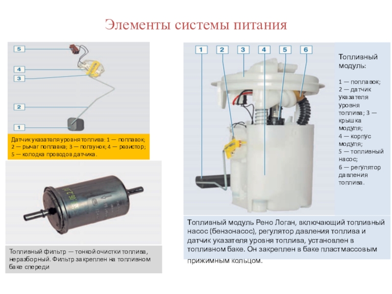 Топливный модуль Рено Логан, включающий топливный насос (бензонасос), регулятор давления топлива и датчик указателя уровня топлива, установлен в топливном баке. Он закреплен в баке пластмассовым прижимным кольцом.