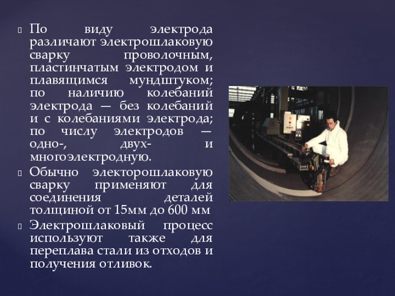 Слайд 21По виду электрода различают электрошлаковую сварку проволочным, пластинчатым электродом и плавящимся