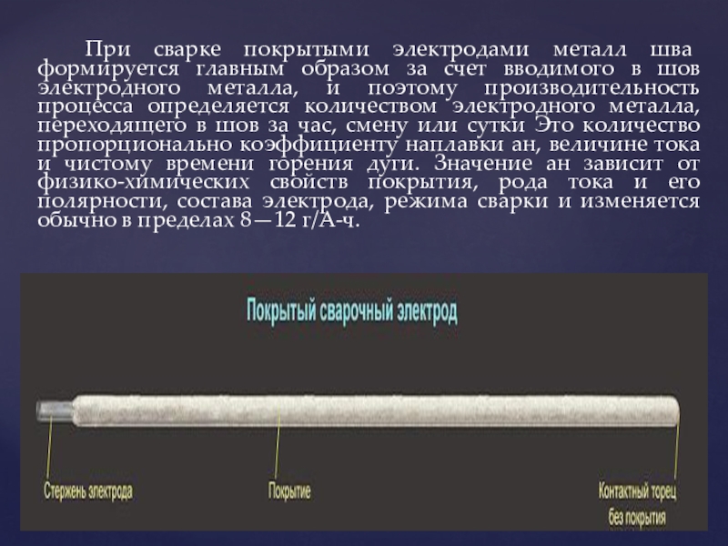 Слайд 12 При сварке покрытыми электродами металл шва формируется главным образом