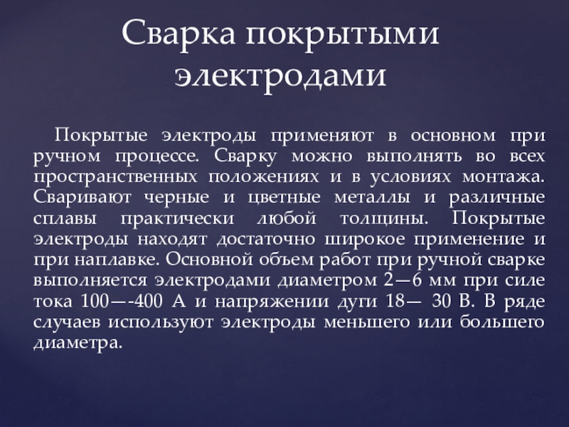 Слайд 10 Покрытые электроды применяют в основном при ручном процессе. Сварку