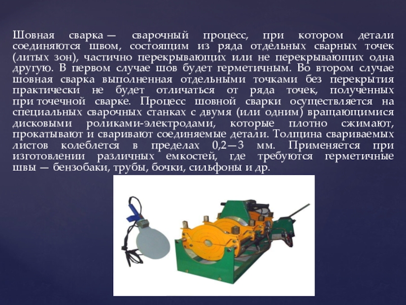 ряда отдельных сварных точек (литых зон), частично перекрывающих или не перекрывающих одна другую. В первом случае шов будет герметичным. Во втором случае шовная сварка выполненная отдельными точками без перекрытия практически не будет отличаться от ряда точек, полученных при точечной сварке. Процесс шовной сварки осуществляется на специальных сварочных станках с двумя (или одним) вращающимися дисковыми роликами-электродами, которые плотно сжимают, прокатывают и сваривают соединяемые детали. Толщина свариваемых листов колеблется в пределах 0,2—3 мм. Применяется при изготовлении различных емкостей, где требуются герметичные швы — бензобаки, трубы, бочки, сильфоны и др.