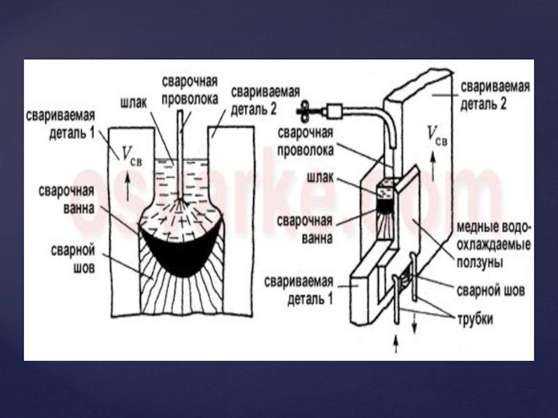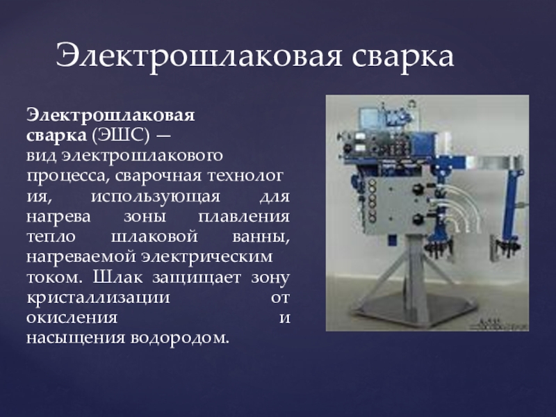 Слайд 20Электрошлаковая сварка (ЭШС) — вид электрошлакового процесса, сварочная технология, использующая для нагрева зоны плавления тепло шлаковой