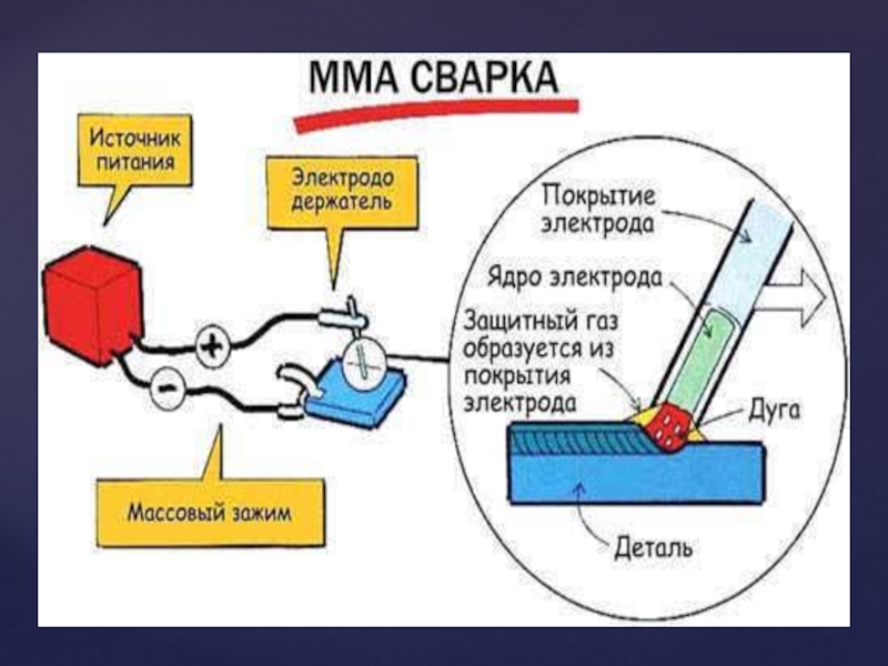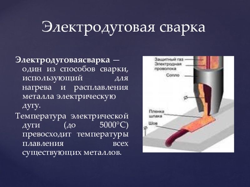 Слайд 7Электродуговаясварка — один из способов сварки, использующий для нагрева и расплавления металла электрическую