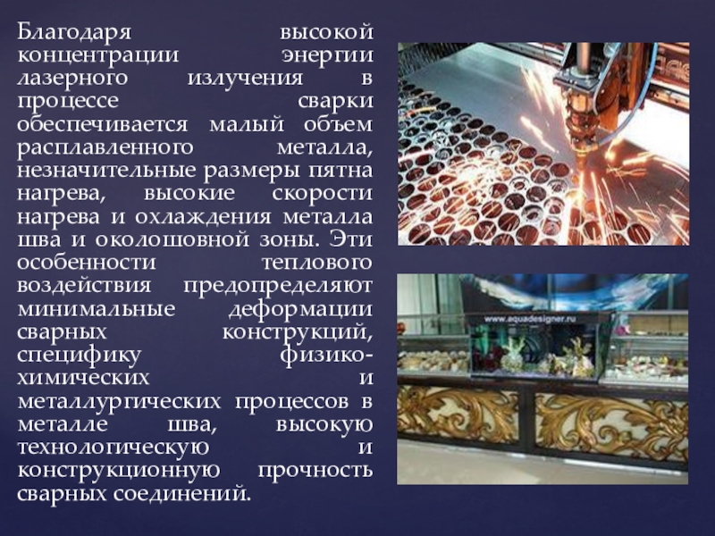 Слайд 25Благодаря высокой концентрации энергии лазерного излучения в процессе сварки обеспечивается малый
