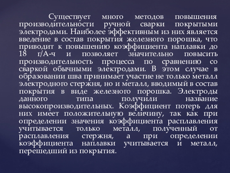Слайд 13 Существует много методов повышения производительности ручной сварки покрытыми электродами.