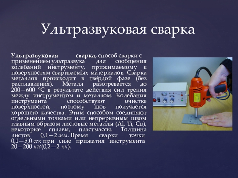 Слайд 23Ультразвуковая сварка, способ сварки с применением ультразвука для сообщения колебаний инструменту, прижимаемому к поверхностям свариваемых