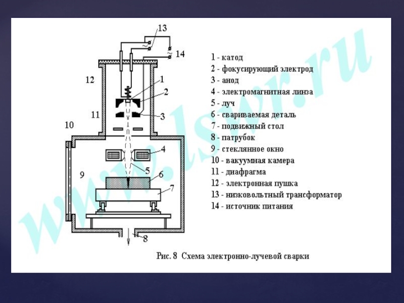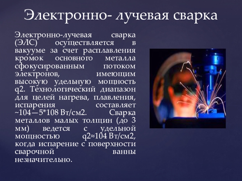 Слайд 26Электронно-лучевая сварка (ЭЛС) осуществляется в вакууме за счет расплавления кромок основного