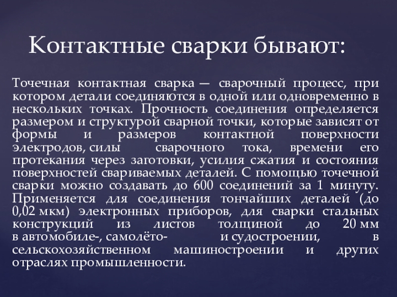 Слайд 16Точечная контактная сварка — сварочный процесс, при котором детали соединяются в одной