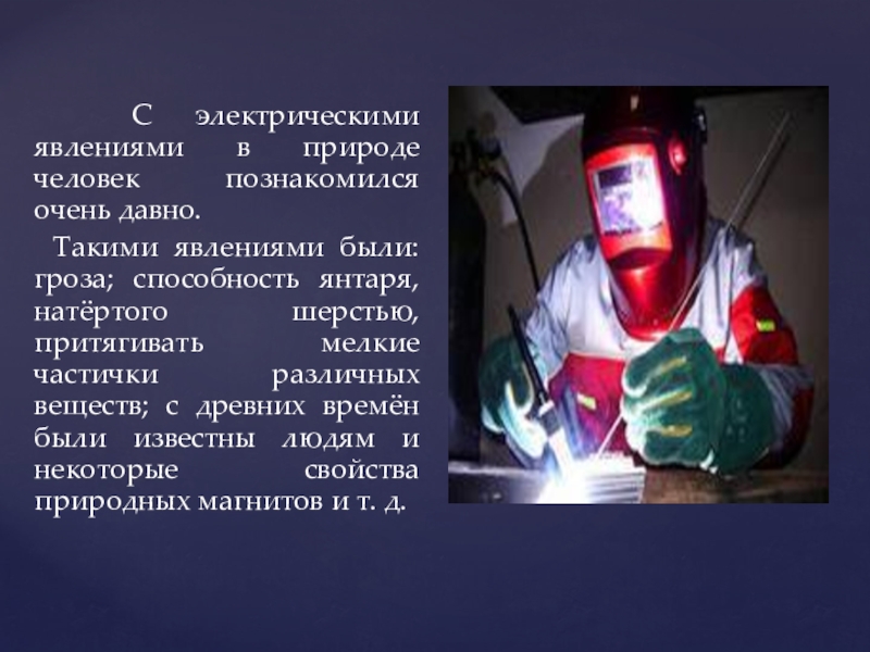 Слайд 3 С электрическими явлениями в природе человек познакомился очень давно.