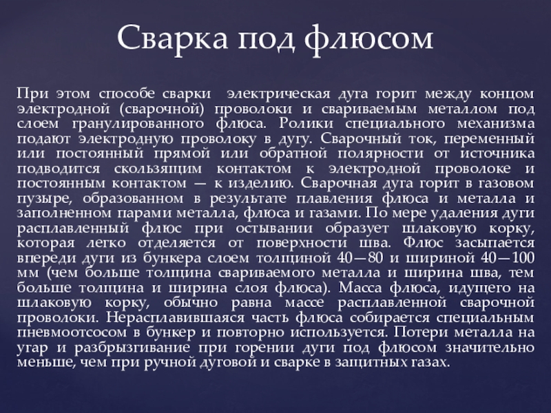 проволоки и свариваемым металлом под слоем гранулированного флюса. Ролики специального механизма подают электродную проволоку в дугу. Сварочный ток, переменный или постоянный прямой или обратной полярности от источника подводится скользящим контактом к электродной проволоке и постоянным контактом — к изделию. Сварочная дуга горит в газовом пузыре, образованном в результате плавления флюса и металла и заполненном парами металла, флюса и газами. По мере удаления дуги расплавленный флюс при остывании образует шлаковую корку, которая легко отделяется от поверхности шва. Флюс засыпается впереди дуги из бункера слоем толщиной 40—80 и шириной 40—100 мм (чем больше толщина свариваемого металла и ширина шва, тем больше толщина и ширина слоя флюса). Масса флюса, идущего на шлаковую корку, обычно равна массе расплавленной сварочной проволоки. Нерасплавившаяся часть флюса собирается специальным пневмоотсосом в бункер и повторно используется. Потери металла на угар и разбрызгивание при горении дуги под флюсом значительно меньше, чем при ручной дуговой и сварке в защитных газах.
