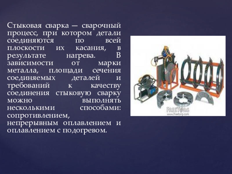 Слайд 19Стыковая сварка — сварочный процесс, при котором детали соединяются по всей плоскости