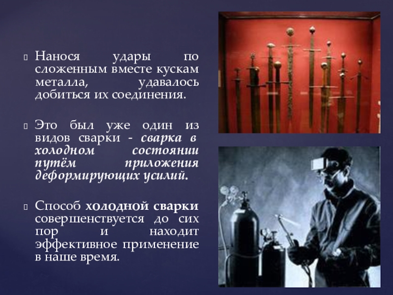 Слайд 4Нанося удары по сложенным вместе кускам металла, удавалось добиться их соединения.