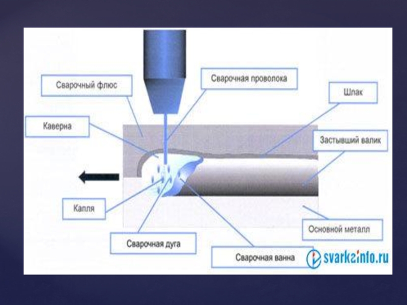 Слайд 8При этом способе сварки электрическая дуга горит между концом электродной (сварочной)