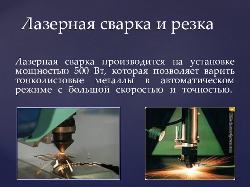 Слайд 24Лазерная сварка производится на установке мощностью 500 Вт, которая позволяет варить