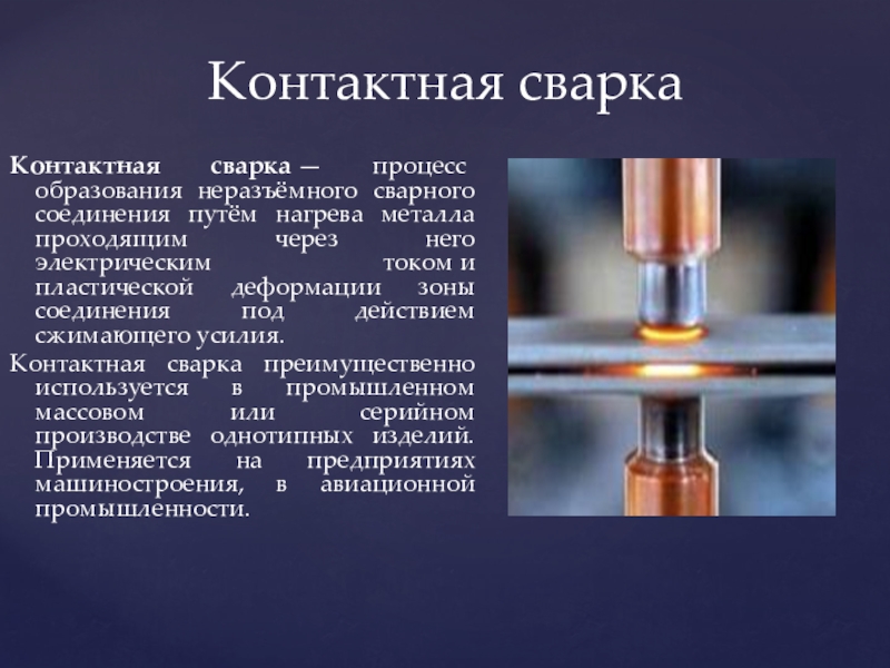 Слайд 15Контактная сварка — процесс образования неразъёмного сварного соединения путём нагрева металла проходящим