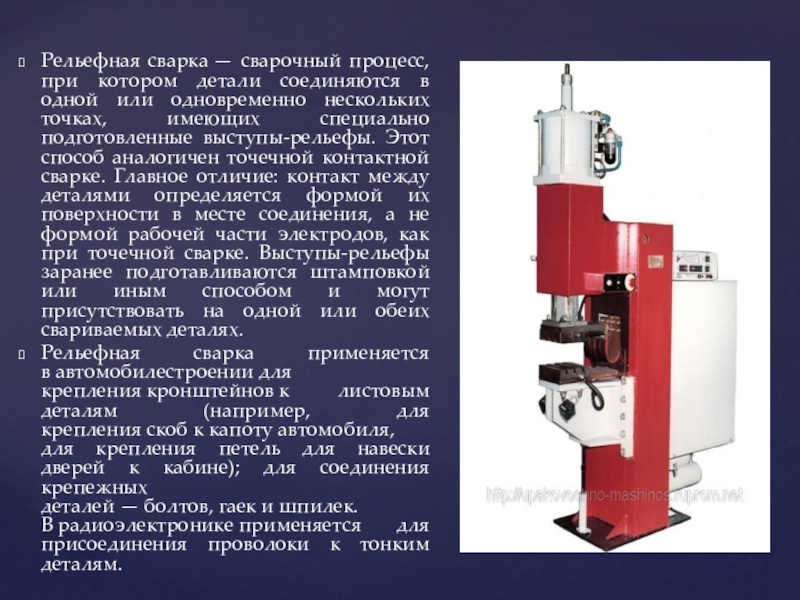 Слайд 17Рельефная сварка — сварочный процесс, при котором детали соединяются в одной или