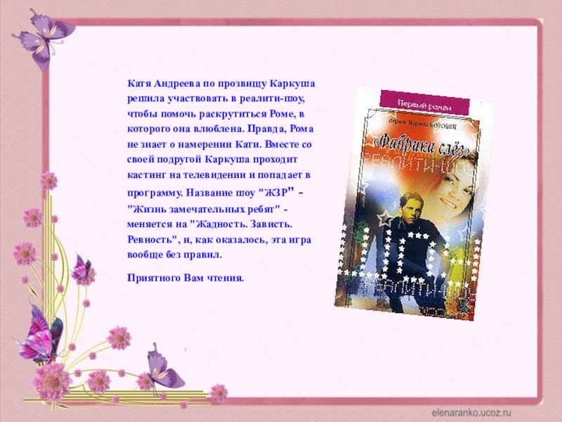 Слайд 5Катя Андреева по прозвищу Каркуша решила участвовать в реалити-шоу, чтобы помочь