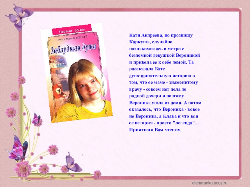 Слайд 10Катя Андреева, по прозвищу Каркуша, случайно познакомилась в метро с бездомной