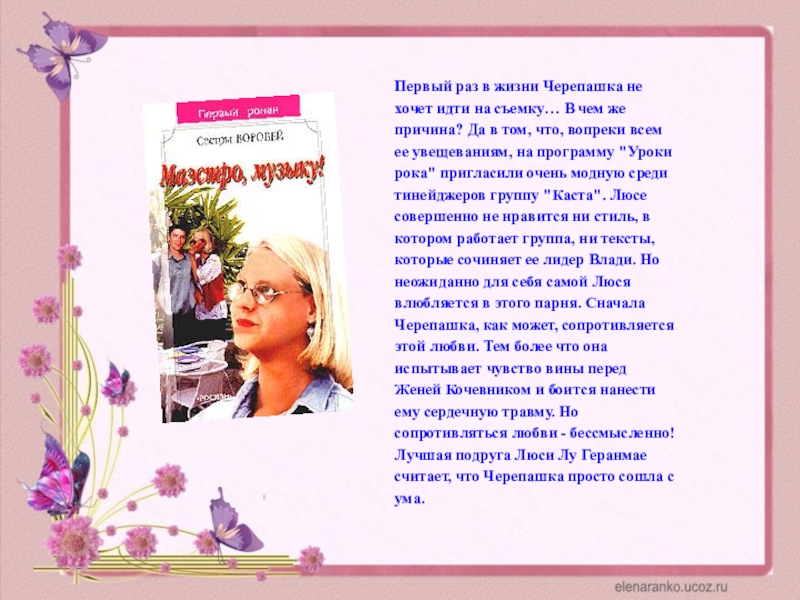 чем же причина? Да в том, что, вопреки всем ее увещеваниям, на программу "Уроки рока" пригласили очень модную среди тинейджеров группу "Каста". Люсе совершенно не нравится ни стиль, в котором работает группа, ни тексты, которые сочиняет ее лидер Влади. Но неожиданно для себя самой Люся влюбляется в этого парня. Сначала Черепашка, как может, сопротивляется этой любви. Тем более что она испытывает чувство вины перед Женей Кочевником и боится нанести ему сердечную травму. Но сопротивляться любви - бессмысленно! Лучшая подруга Люси Лу Геранмае считает, что Черепашка просто сошла с ума.
