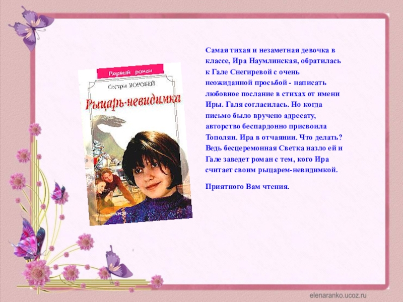 Гале Снегиревой с очень неожиданной просьбой - написать любовное послание в стихах от имени Иры. Галя согласилась. Но когда письмо было вручено адресату, авторство беспардонно присвоила Тополян. Ира в отчаянии. Что делать? Ведь бесцеремонная Светка назло ей и Гале заведет роман с тем, кого Ира считает своим рыцарем-невидимкой.
