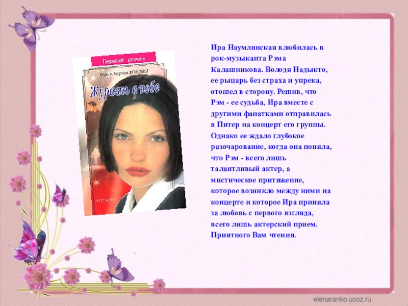 без страха и упрека, отошел в сторону. Решив, что Рэм - ее судьба, Ира вместе с другими фанатками отправилась в Питер на концерт его группы. Однако ее ждало глубокое разочарование, когда она поняла, что Рэм - всего лишь талантливый актер, а мистическое притяжение, которое возникло между ними на концерте и которое Ира приняла за любовь с первого взгляда, всего лишь актерский прием. Приятного Вам чтения.