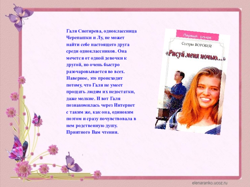 друга среди одноклассников. Она мечется от одной девочки к другой, но очень быстро разочаровывается во всех. Наверное, это происходит потому, что Галя не умеет прощать людям их недостатки, даже мелкие. И вот Галя познакомилась через Интернет с таким же, как она, одиноким поэтом и сразу почувствовала в нем родственную душу. Приятного Вам чтения.