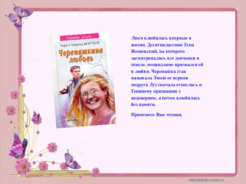 все девчонки в школе, неожиданно признался ей в любви. Черепашка (так называла Люсю ее верная подруга Лу) сначала отнеслась к Гениному признанию с недоверием, а потом влюбилась без памяти.
