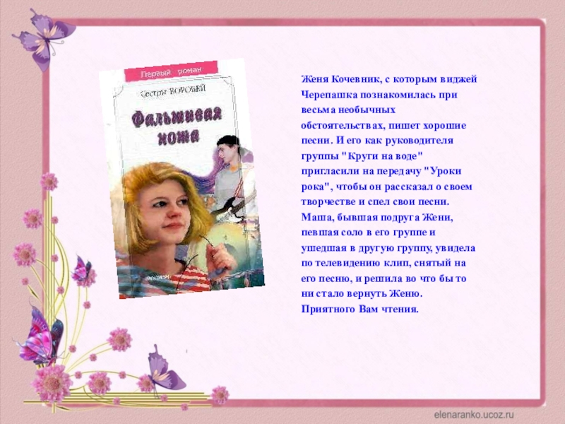 пишет хорошие песни. И его как руководителя группы "Круги на воде" пригласили на передачу "Уроки рока", чтобы он рассказал о своем творчестве и спел свои песни. Маша, бывшая подруга Жени, певшая соло в его группе и ушедшая в другую группу, увидела по телевидению клип, снятый на его песню, и решила во что бы то ни стало вернуть Женю. Приятного Вам чтения.