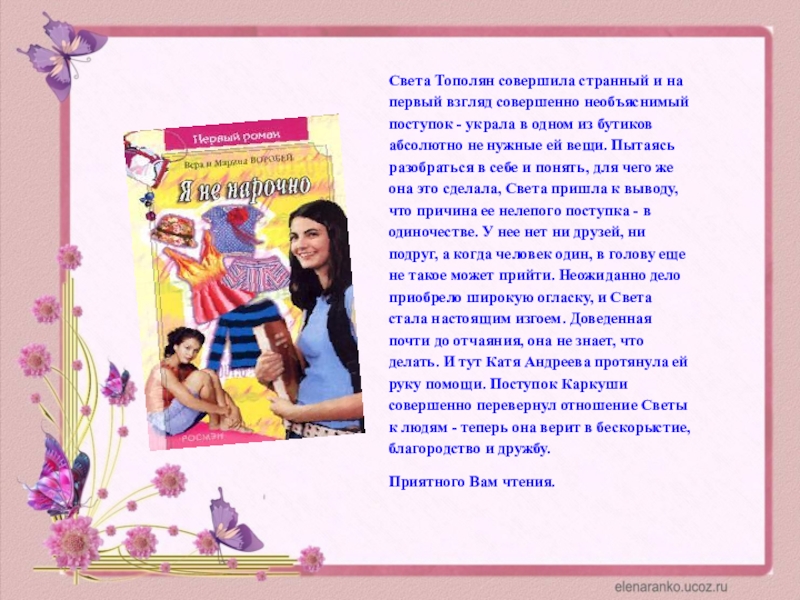 - украла в одном из бутиков абсолютно не нужные ей вещи. Пытаясь разобраться в себе и понять, для чего же она это сделала, Света пришла к выводу, что причина ее нелепого поступка - в одиночестве. У нее нет ни друзей, ни подруг, а когда человек один, в голову еще не такое может прийти. Неожиданно дело приобрело широкую огласку, и Света стала настоящим изгоем. Доведенная почти до отчаяния, она не знает, что делать. И тут Катя Андреева протянула ей руку помощи. Поступок Каркуши совершенно перевернул отношение Светы к людям - теперь она верит в бескорыстие, благородство и дружбу.