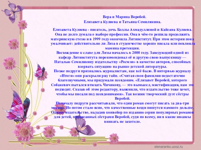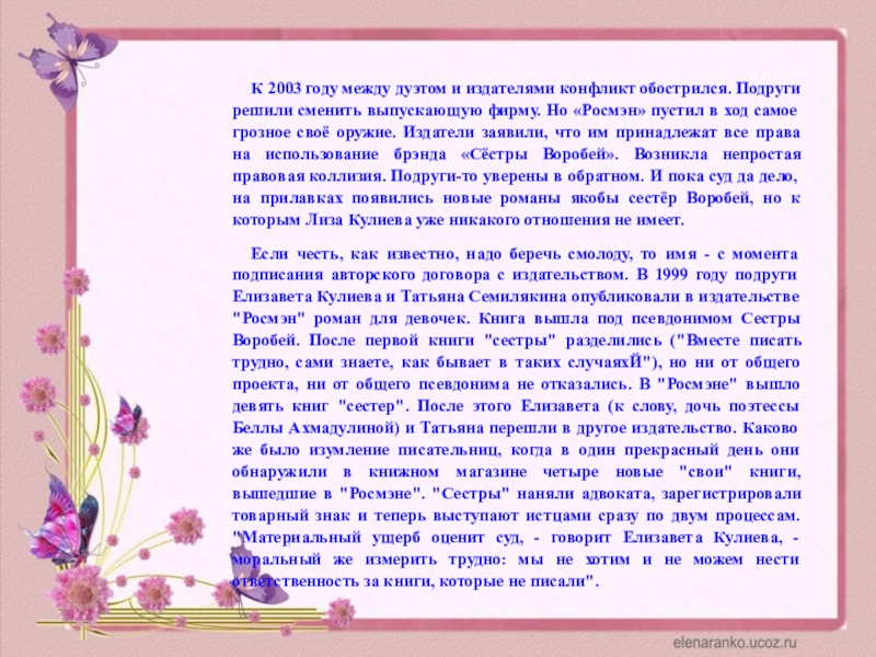 сменить выпускающую фирму. Но «Росмэн» пустил в ход самое грозное своё оружие. Издатели заявили, что им принадлежат все права на использование брэнда «Сёстры Воробей». Возникла непростая правовая коллизия. Подруги-то уверены в обратном. И пока суд да дело, на прилавках появились новые романы якобы сестёр Воробей, но к которым Лиза Кулиева уже никакого отношения не имеет.