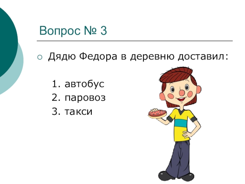 Вопрос № 3Дядю Федора в деревню доставил: 			1. автобус	2. паровоз	3. такси