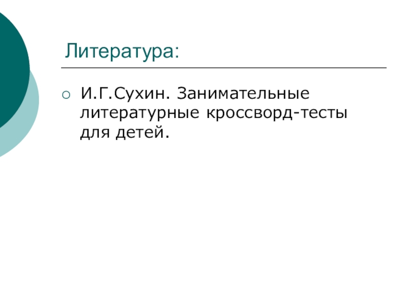 Литература:И.Г.Сухин. Занимательные литературные кроссворд-тесты для детей.