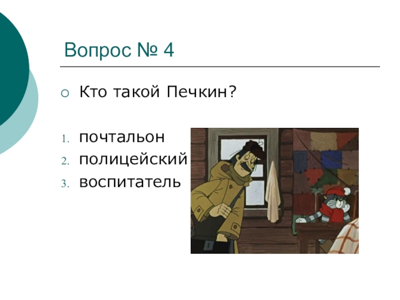 Вопрос № 4Кто такой Печкин?почтальонполицейскийвоспитатель