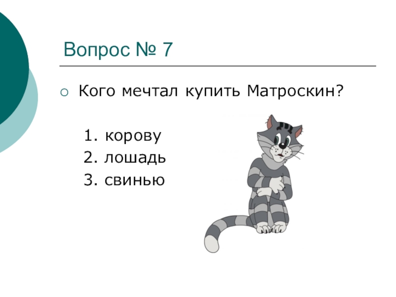 Вопрос № 7Кого мечтал купить Матроскин?			1. корову	2. лошадь	3. свинью