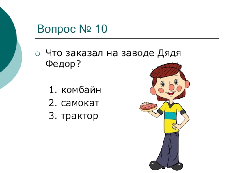 Вопрос № 10Что заказал на заводе Дядя Федор?		1. комбайн	2. самокат	3. трактор