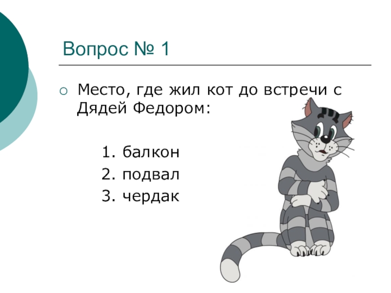 Вопрос № 1Место, где жил кот до встречи с Дядей Федором: 1. балкон 2. подвал 3. чердак