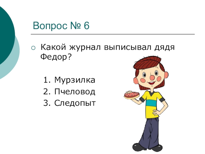 Вопрос № 6Какой журнал выписывал дядя Федор?	1. Мурзилка	2. Пчеловод	3. Следопыт