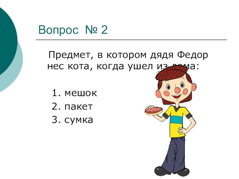 Вопрос № 2  Предмет, в котором дядя Федор нес кота, когда ушел из дома:  1.
