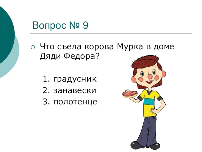 Вопрос № 9Что съела корова Мурка в доме Дяди Федора?	1. градусник	2. занавески	3. полотенце