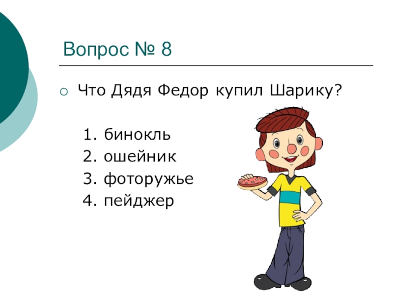 Вопрос № 8Что Дядя Федор купил Шарику?		1. бинокль	2. ошейник	3. фоторужье	4. пейджер
