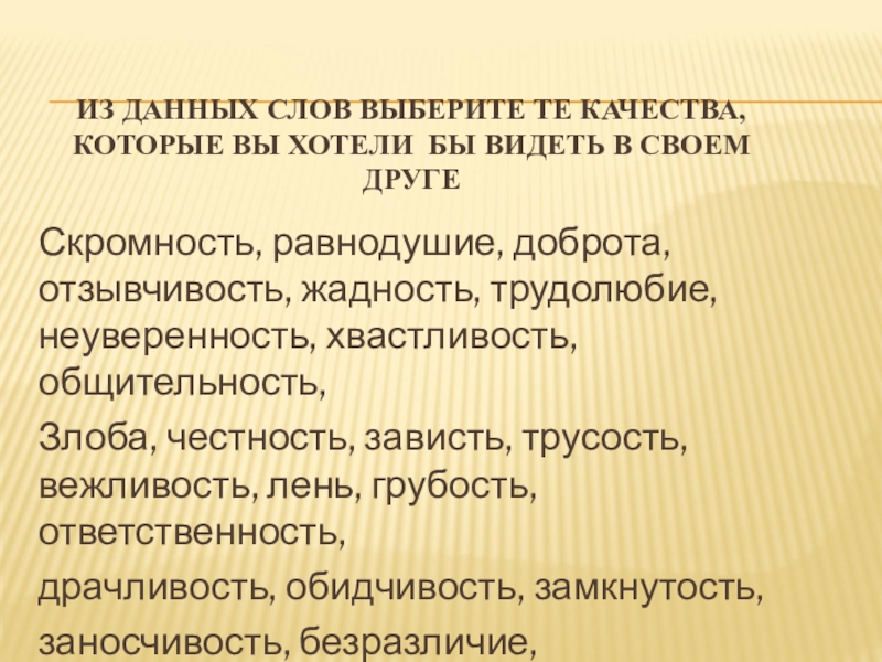 Злоба, честность, зависть, трусость, вежливость, лень, грубость, ответственность,
