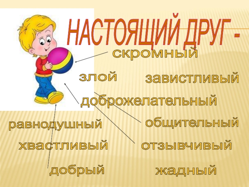 Скромность, равнодушие, доброта, отзывчивость, жадность, трудолюбие, неуверенность, хвастливость, общительность,